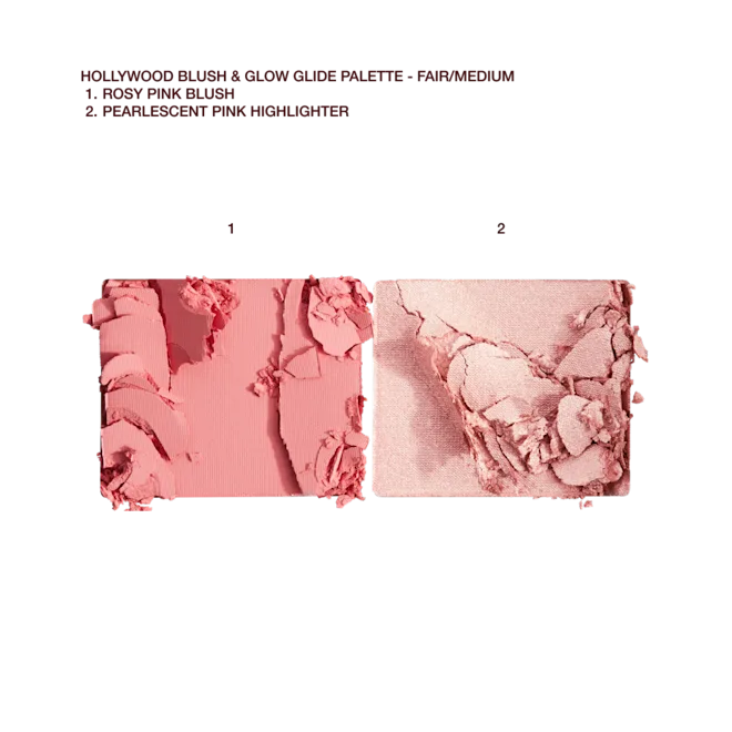 Mini cheek palette with rosy-pink blush and pearlescent pink highlighter shades for a HOLLYWOOD EFFECT blush and glow!